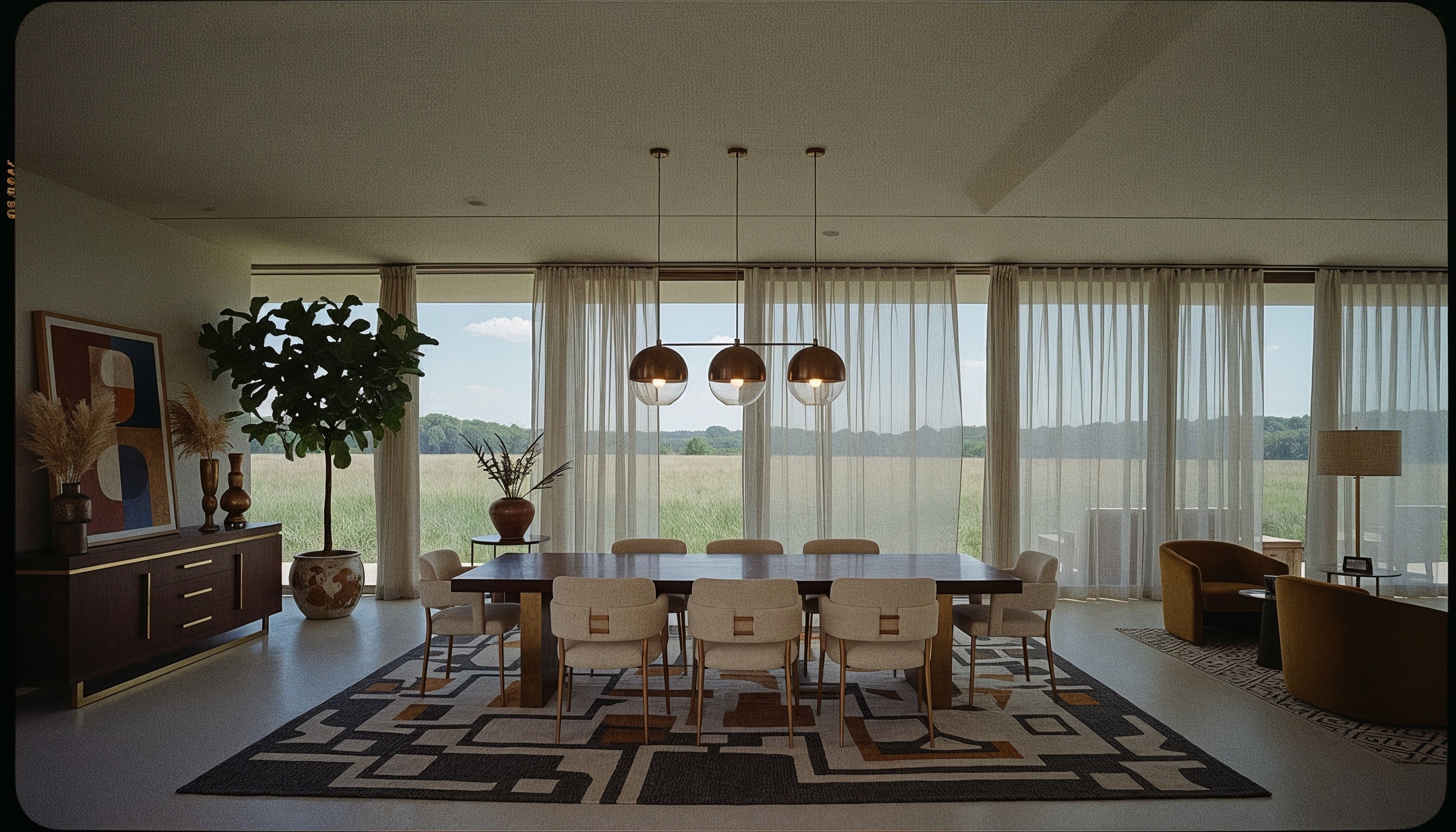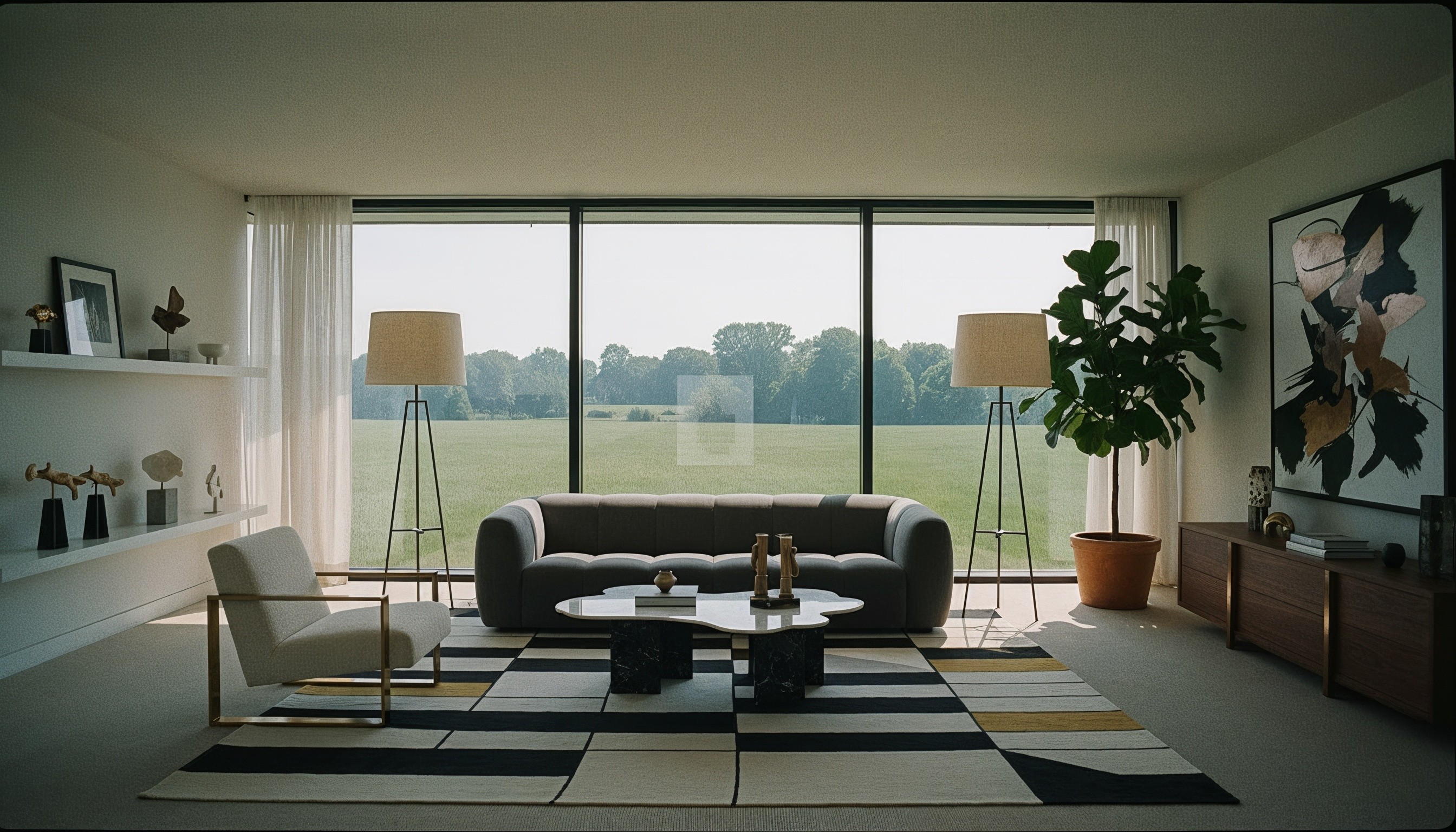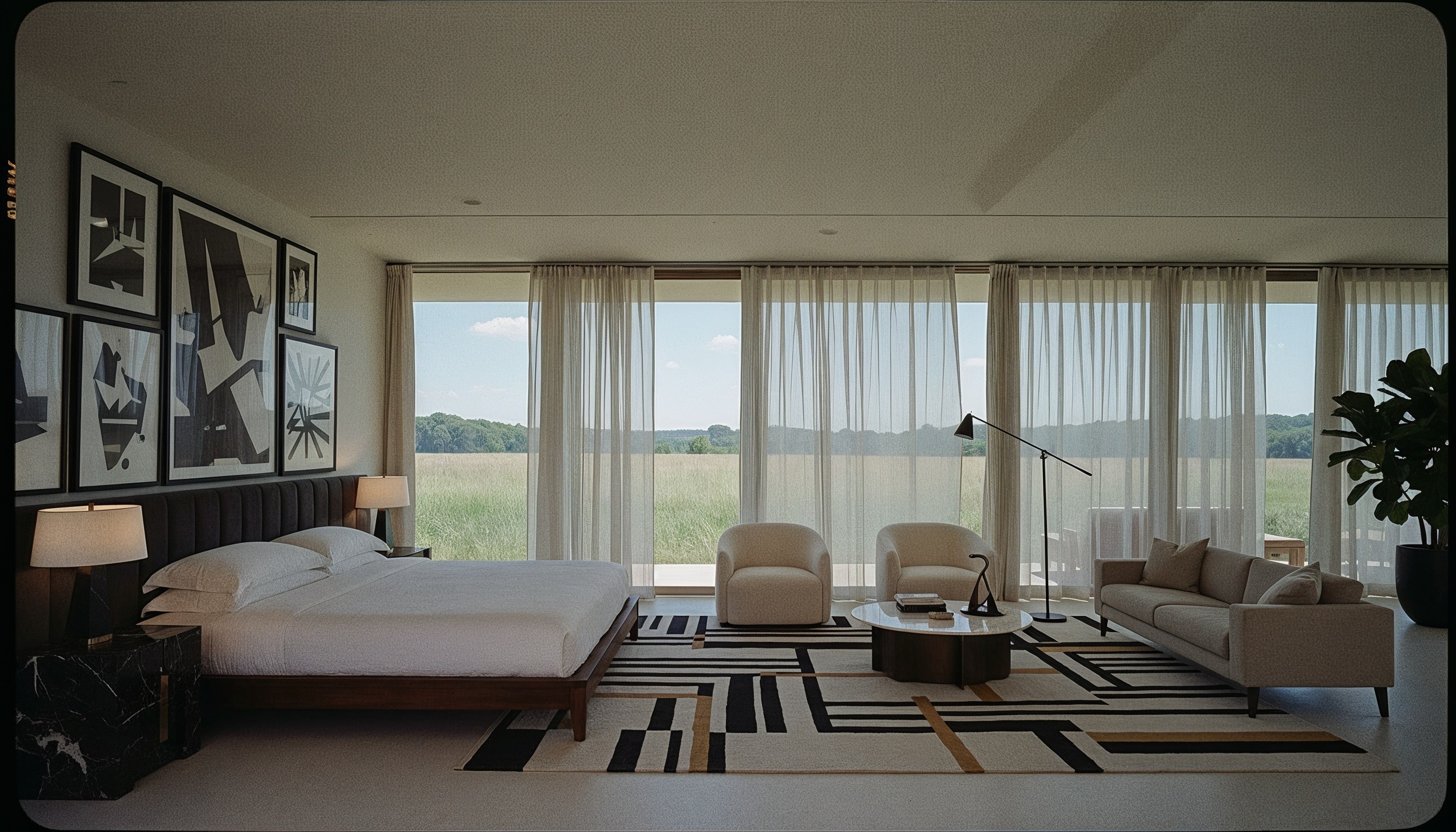 Inside, the plan is organized as a sequence of open living spaces aligned to the view, supported by warm wood built ins and a limited palette of soft plaster, timber, and stone. Furnishings sit low and composed, allowing the glazing to remain the dominant gesture and the landscape to stay visually present from nearly every position. Sheer curtains filter sun throughout the day, shifting the atmosphere from bright and expansive to quiet and intimate without changing the clarity of the architecture.