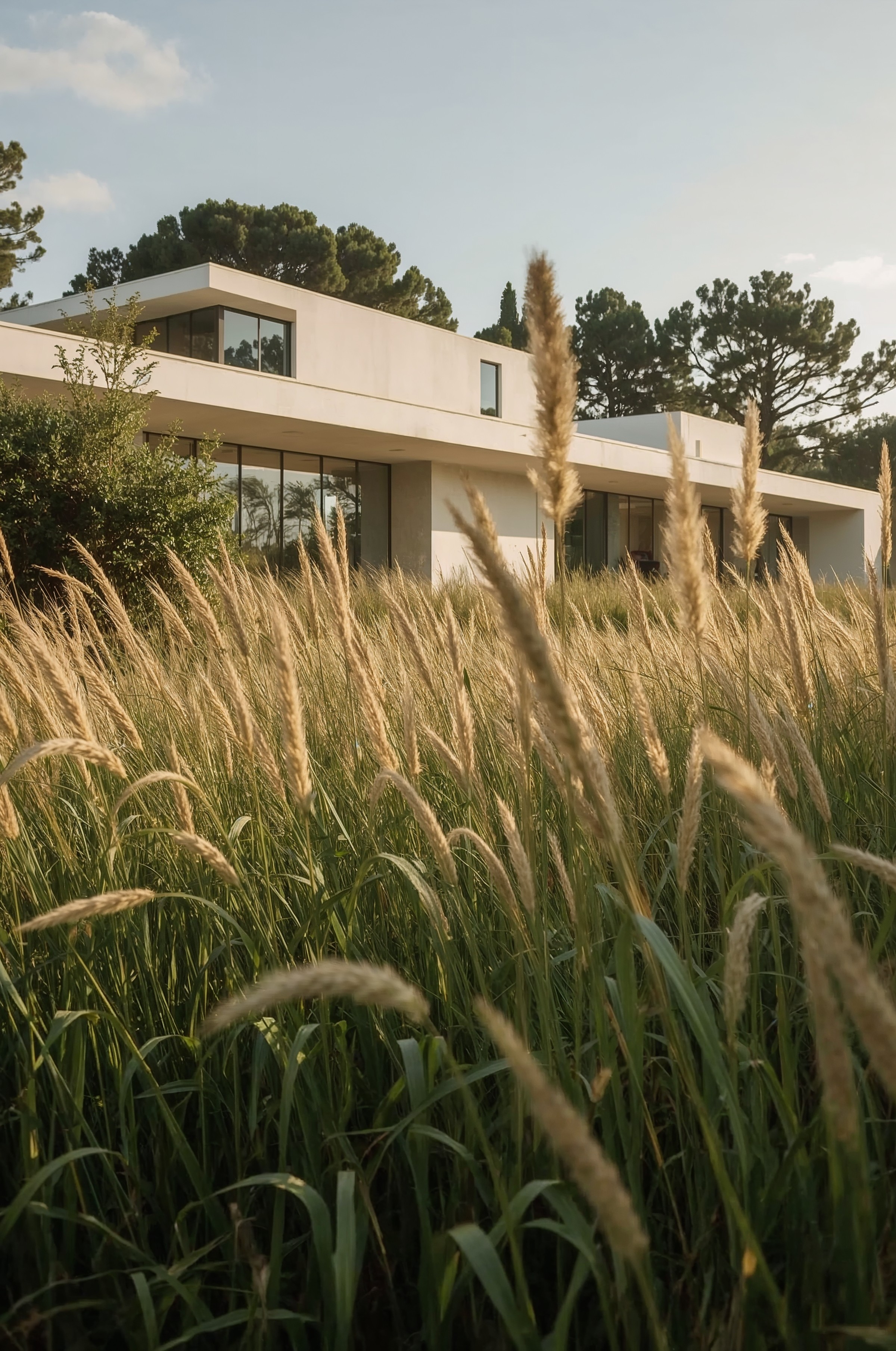 Inside, a restrained palette and soft drapery filter daylight and calibrate privacy without closing the house off. The landscape is treated as an architectural element, with ornamental grasses and low planting creating a thickened perimeter that softens the slab edges and frames the approach.